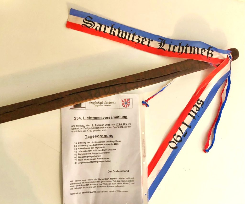 Die jährliche Lichtmessversammlung in Sarkwitz findet seit 1790 traditionell am 02. Februar statt. Im Januar hatte die beiden Knüppelträger Christian Schulze und Oliver Warschkow alle Sarkwitzer Männer per Lichtmessknüppel mit der handgeschnitzten Gravur „Dorfschaft *Sarkwitz* 1826“ persönlich besucht und eingeladen.